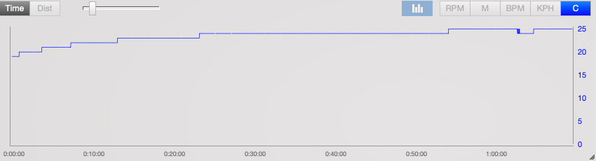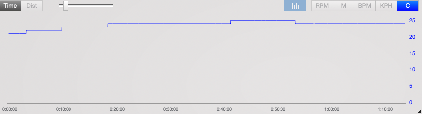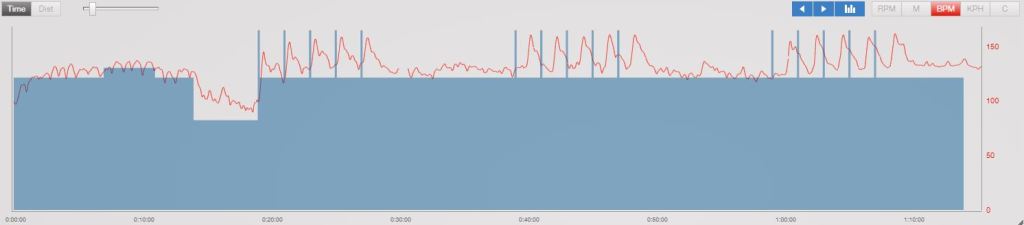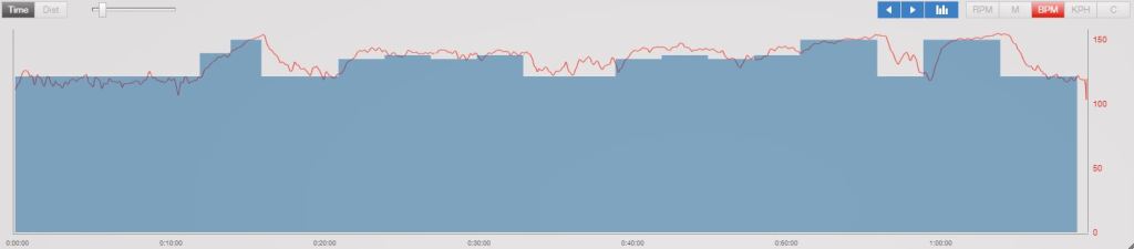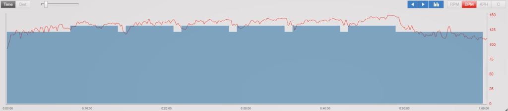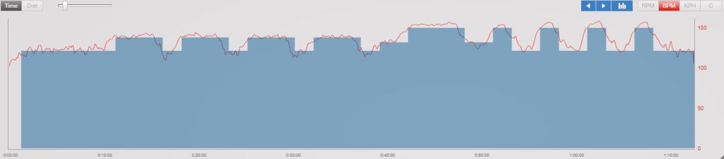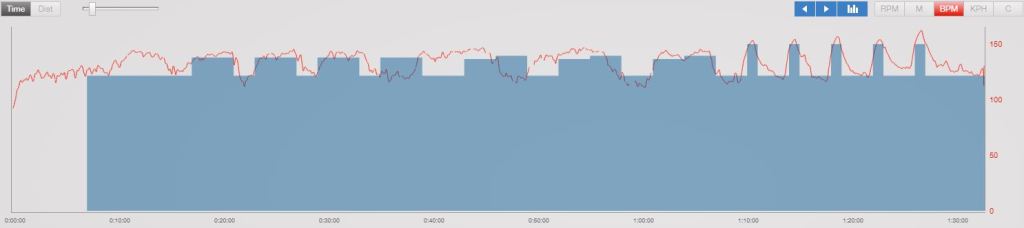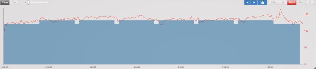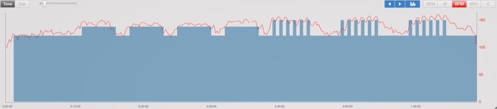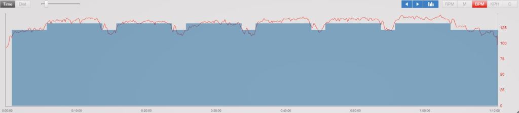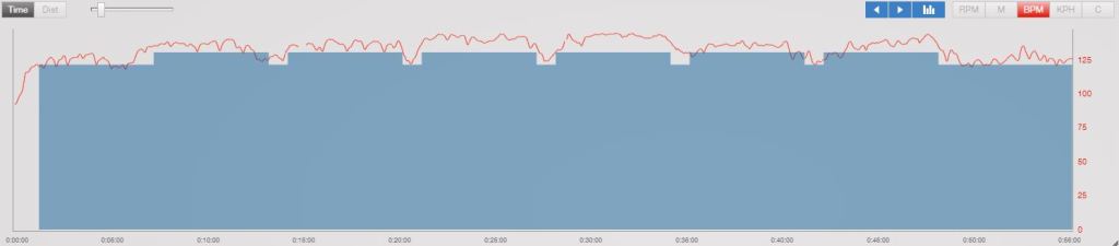 The week consisted of dour sessions – two sets of lighter one first, than a harder one with higher heart-rate (thought short) requirement. In the last session you can see that in the end, after the last stonger and longer intervals the heart-rate did not come back quickly to the level where it should be. These as well have pushed a bit more the mental side, as they required 100% FTHR for longer than before (2 minutes).